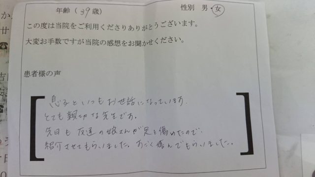 39歳 女性 寝違え、ぎっくり腰 2018.02.16 息子といつもお世話になっています。 とても親切な先生です。 先日も友達の娘さんが足を痛めたので紹介させてもらいました。 すごく喜んでもらえました。