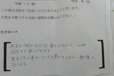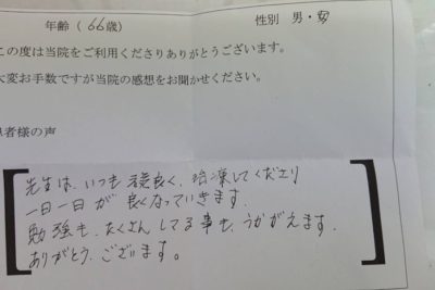 13歳 男 突き指、側弯症による背中の痛み 2018.02.02 母親といつも通っています。とても頼りにしています。 この前、お腹が痛くて動けない僕を帰る頃には治してくれました。体育でよくケガをしますが先生のおかげで早く良くなります。 続きはこちら